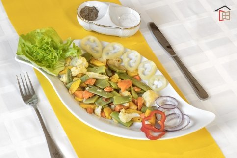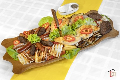 Ei MilchChevapchichi, bayrische Grillwurst, 2 Stück auf einer Eisenplatte gebratene Hähnchenbrust, 3 Stück hausgemachter Grillkäse, 1 Stück Bier-Knoblauch-Grillrippchen, 1 Stück auf Lavastein gebackenes Fladenbrot, gegrillte Gemüsevariationen und Risi-Pisi.